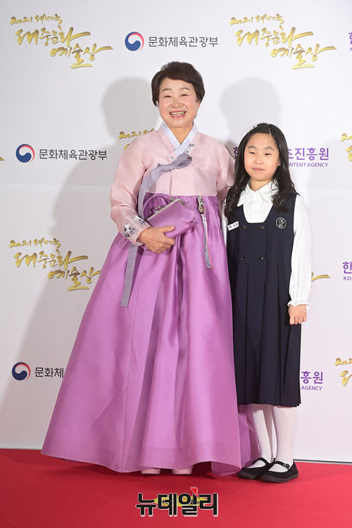 최수민 성우와 손녀가 28일 오후 서울 중구 국립극장 해오름극장에서 열린 '2021 대한민국 대중문화예술상 시상식'에 입장하고 있다.올해 12회를 맞은 대중문화예술상 시상식은 가수, 배우, 희극인, 성우, 방송작가, 연주가 등 다양한 분야를 아우르는 대중문화예술인들의 자긍심을 고취하기 위해 마련된 시상식이다.문화예술 공로자에게 주는 최고 훈장인 금관문화훈장은 영화 미나리의 배우 윤여정이 수훈자로 선정됐다.대통령 표창에는 △연기자 김영철 △배우 정우성 △가수 김연자 △가수 이적 △김태호PD △작가 박재범 △성우 최수민 등이 이름을 올렸다.시상식은 오후 6시부터 콘진원과 더케이팝 유튜브 채널을 통해 생중계 된다.