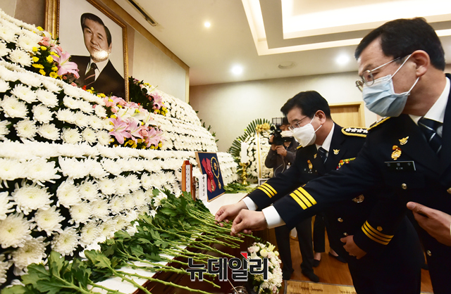 김창룡 경찰청장과 김병수 경찰청 경비국장이 28일 오후 서울 종로구 서울대병원 장례식장에 마련된 故 노태우 전 대통령 빈소에서 조문을 마친 뒤 노재헌 변호사에게 위로의 말을 전하고 있다. (사진=공동취재단)
