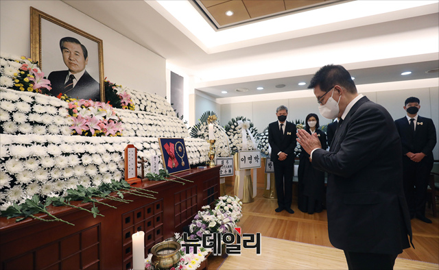 박지원 국정원장이 29일 오후 서울 종로구 서울대병원 장례식장에 마련된 고 노태우 전 대통령 빈소를 찾아 조문하고 있다. (사진=공동취재단)