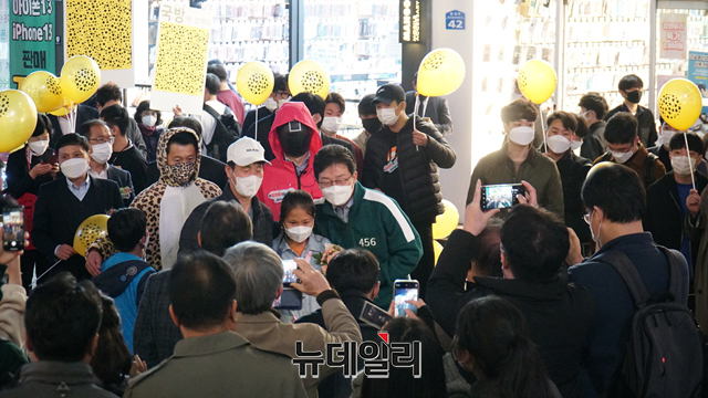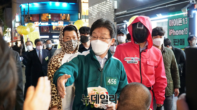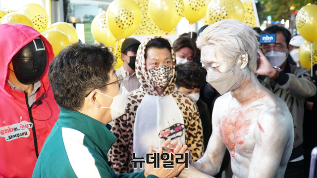 넷플릭스 웹드라마 '오징어 게임' 복장을 착용한 유승민 국민의힘 대선 경선 후보가 30일 오후 대구 중구 동성로에서 시민들과 인사를 나누고 있다. (사진=유승민 캠프)