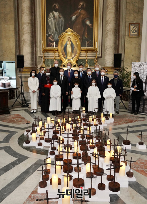 문재인 대통령이 29일(현지 시각) 이탈리아 로마 산티냐시오 디 로욜라 성당에서 진행된 '철조망 평화가 되다' 전시회에서 한반도를 형상화한 전시작품의 LED 촛불 점등식을 하고 있다. (사진=청와대)