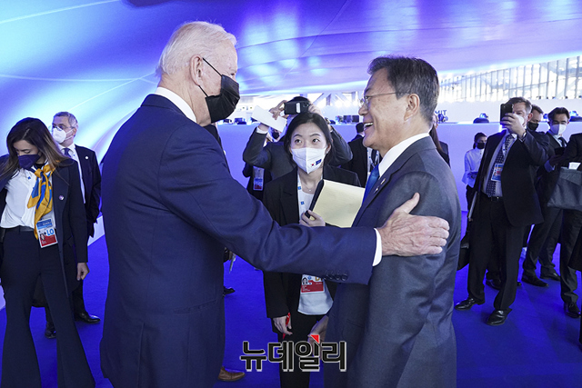 문재인 대통령이 30일(현지시간) 이탈리아 로마 누볼라 컨벤션 센터에서 진행된 주요 20개국(G20) 정상회의 라운지에서 조 바이든 미국 대통령과 만나 악수를 나누고 있다. (사진=청와대)