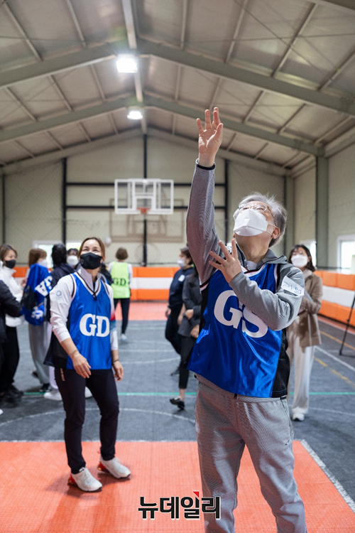 이재명 더불어민주당 대선 후보가 31일 오전 경기 고양시 상암농구장에서 열린 2030여성 생활체육으로 만나다 행사에서 여성들과 기념촬영을 하고 있다. (사진=이재명 캠프)