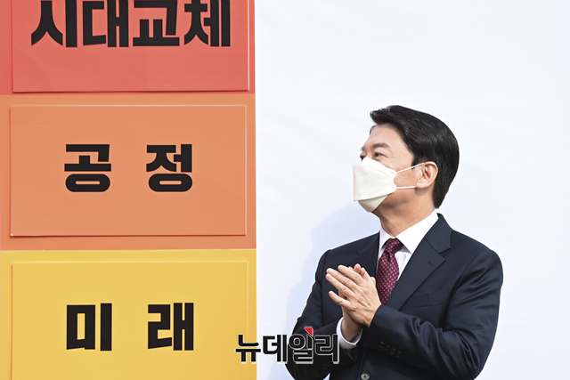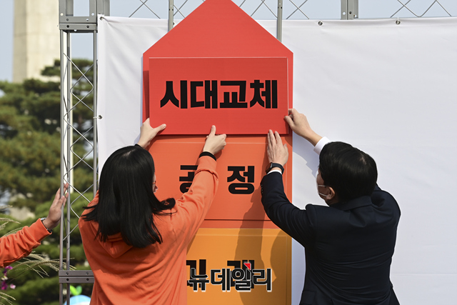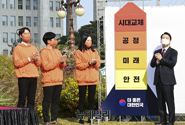 안철수 국민의당 대표가 1일 오전 국회 잔디광장에서 열린 제20대 대통령 선거 출마 기자회견에서 로켓 모형에 당원들과 함께 '시대교체' 판넬을 부착하는 퍼포먼스를 하고 있다.