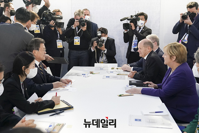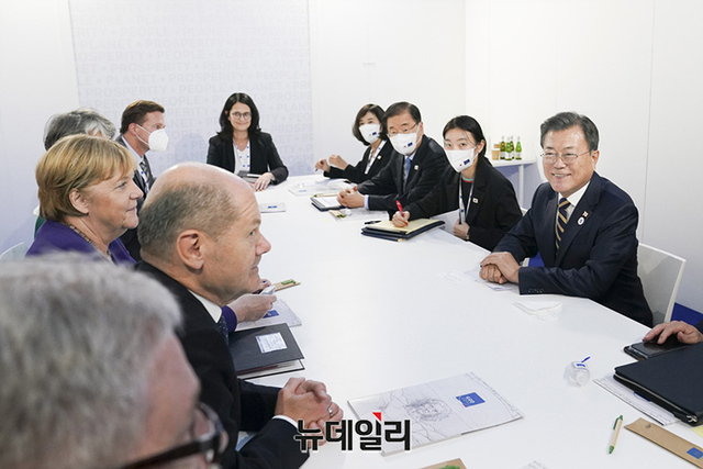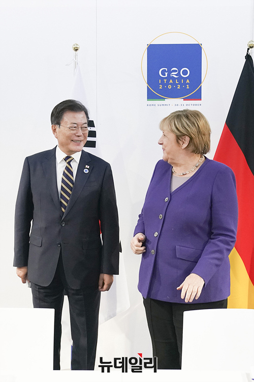 G20 참석차 이탈리아 로마를 방문 중인 문재인 대통령이 31일(현지시간) 앙겔라 메르켈 독일 총리와 정상회담에서 기념촬영을 하고 있다. (사진=청와대)