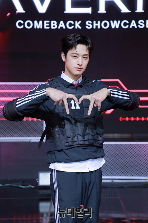 아이돌그룹 더보이즈(THE BOYZ) 멤버 주연이 1일 오후 온라인으로 진행된 싱글 3집 '매버릭(MAVERICK)' 발매 기념 쇼케이스에서 포즈를 취하고 있다.