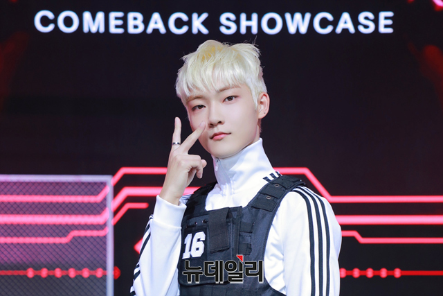 아이돌그룹 더보이즈(THE BOYZ) 멤버 케빈이 1일 오후 온라인으로 진행된 싱글 3집 '매버릭(MAVERICK)' 발매 기념 쇼케이스에서 포즈를 취하고 있다.