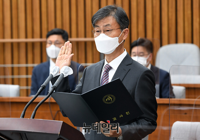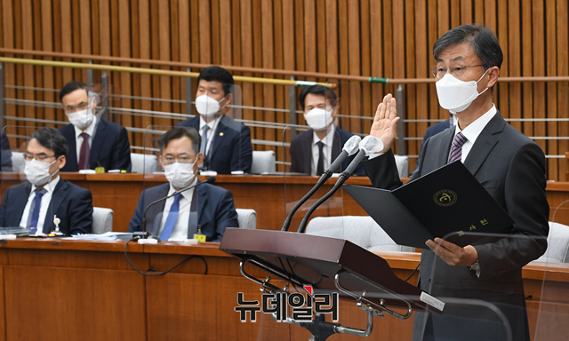 최재해 감사원장 후보자가 2일 국회에서 열린 인사청문회에서 증인선서를 하고 있다. (사진=공동취재단)