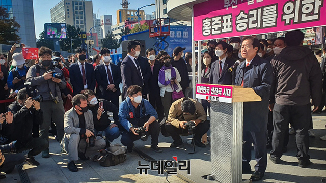 홍준표 국민의힘 대선 예비후보가 2일 오전 부산역 광장에서 열린 부산·울산·경남시도민에게 드리는 승리를위한 특별기자회견에서 발언하고 있다. 홍 후보는 "김영삼(YS) 전 대통령 이후 부산·울산·경남이 배출한 또 한 명의 대통령이 되게 도와달라"며 지지를 호소했다. (사진=홍준표 캠프)