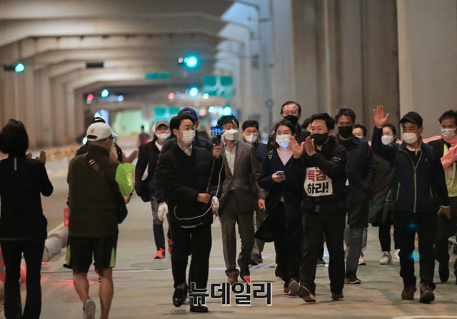 대장동 게이트의 특검 수용을 촉구하며 도보행진에 나선 원희룡 국민의힘 대선 예비후보가 2일 저녁 서울 서초구 잠수교 일대를 이동하며 시민들과 인사를 나누고 있다.