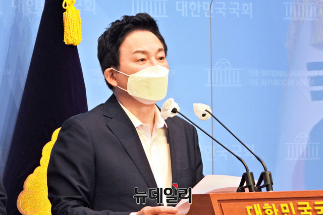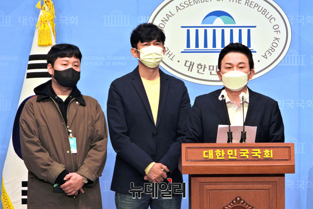 원희룡 국민의힘 대선경선 후보가 3일 오전 국회 소통관에서 소상공인 대표 경찰 조사 관련 기자회견을 갖고 있다.