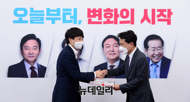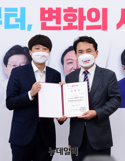 이준석 국민의힘 대표가 3일 오전 국회에서 열린 '이재명 비리 국민검증특별위원회' 임명장 수여식에서 김진태 이재명 비리 국민검증 특별위원회 위원장에게 임명장을 수여하고 있다. (사진=공동취재단)