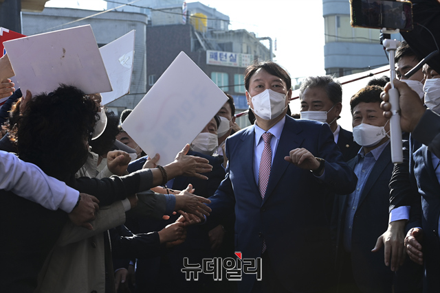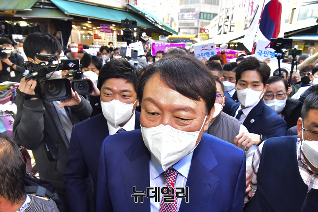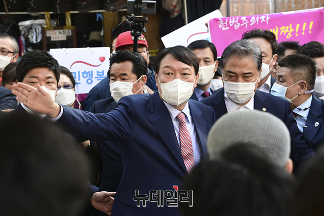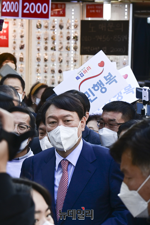 윤석열 국민의힘 대선 예비후보가 3일 오전 서울 중구 남대문시장을 방문해 시민들과 인사를 나누고 있다.