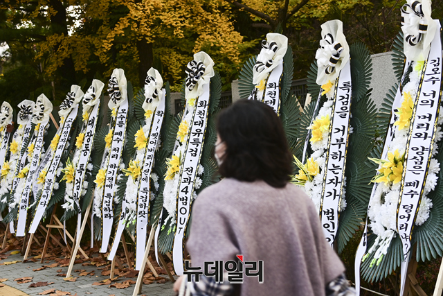 대장동 개발사업 특혜 의혹 사건에 관련해 특검 도입을 촉구하는 근조 화환이 3일 오후 서울 서초구 대검찰청 정문 앞에 놓여 있다.