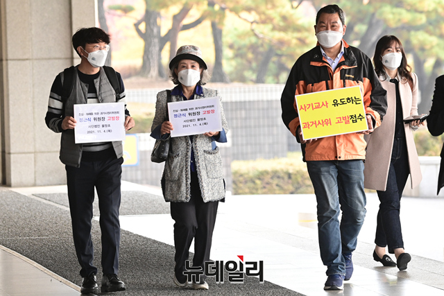 북한인권단체 물망초가 4일 오전 서울 서초구 서울중앙지방검찰청에서 정근식 진실·화해를위한과거사정리위원장(과거사위)을 사기교사와 직권남용 혐의로 고발하기 위해 민원실로 들어서고 있다.