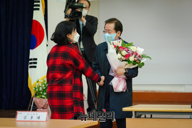 [포토] 꽃다발 받은 홍준표 국민의힘 대선 예비후보