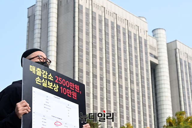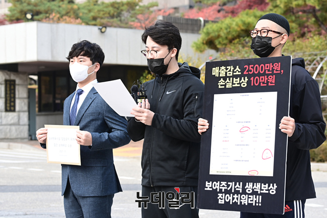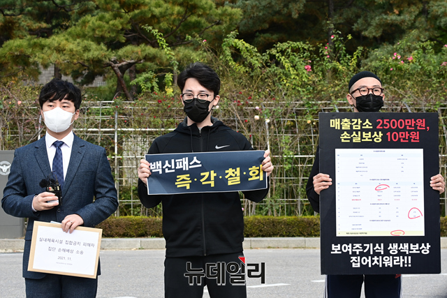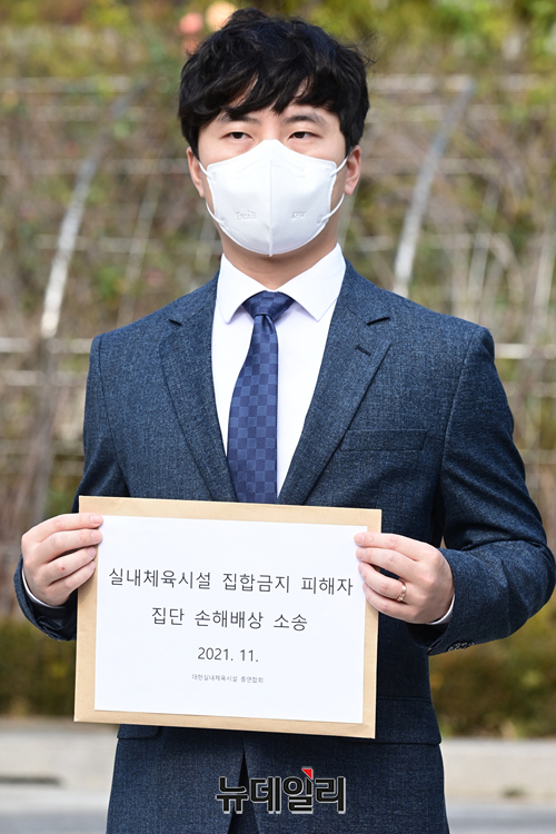 대한실내체육시설 총연합회가 4일 오전 서울 서초구 서울중앙지방법원 정문 앞에서 코로나 손실 보상 집단 소송 관련 기자회견을 갖고 있다.