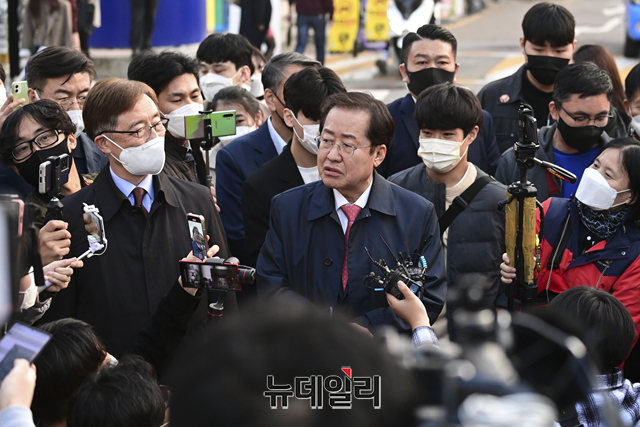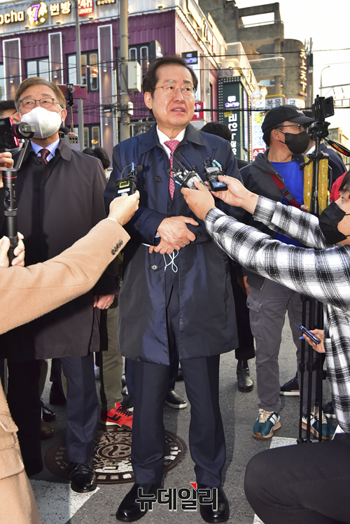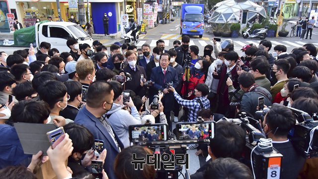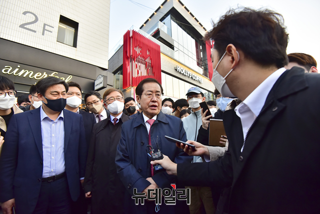 홍준표 국민의힘 대선 예비후보가 4일 오후 서울 마포구 홍대거리를 방문해 시민들에게 인사를 나누고 있다.