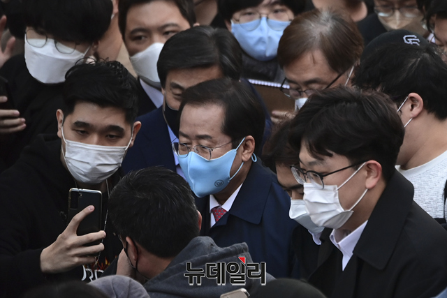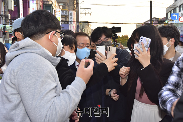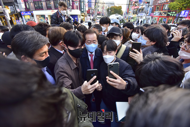 홍준표 국민의힘 대선 예비후보가 4일 오후 서울 마포구 홍대거리를 방문해 청년들과 기념촬영을 하고 있다.
