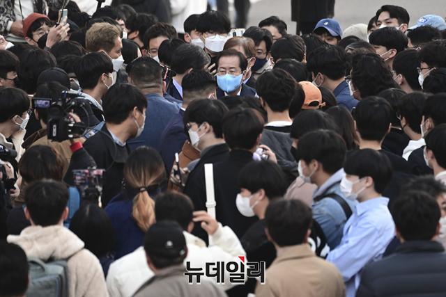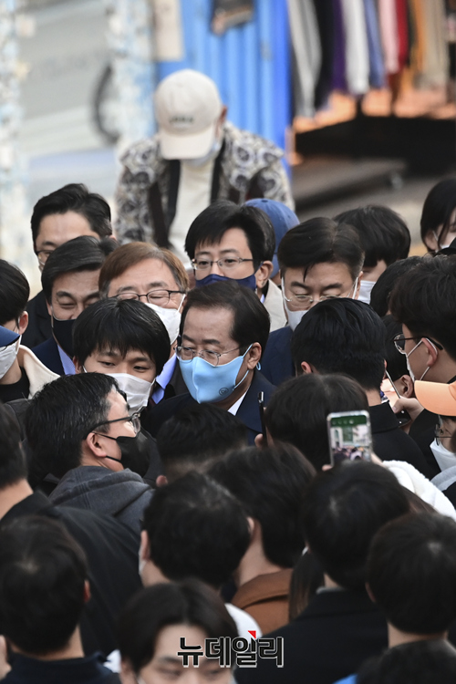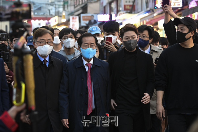 홍준표 국민의힘 대선 예비후보, 최재형 전 감사원장 등이 4일 오후 서울 마포구 홍대거리를 방문해 이동하고 있다.