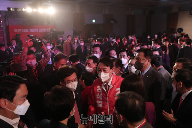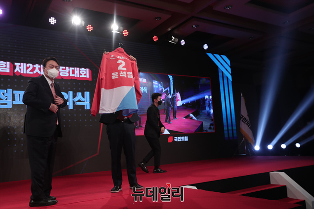 국민의힘 대선 후보에 선출된 윤석열 후보가 5일 오후 서울 용산구 백범김구기념관에서 열린 제2차 전당대회에서 선거운동에서 입을 당 점퍼를 입고 손을 들어 화답하고 있다. (사진=윤석열 캠프)