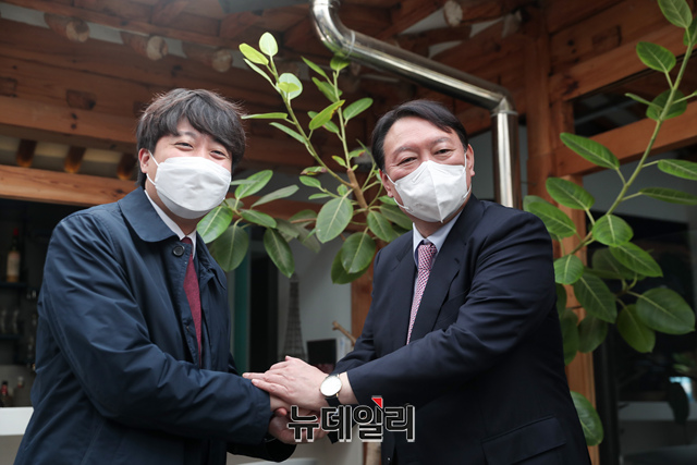 이준석 국민의힘 대표와 윤석열 대선 후보가 6일 오후 서울 마포구 한 음식점에서 오찬에 앞서 악수하고 있다. (사진=윤석열 캠프)