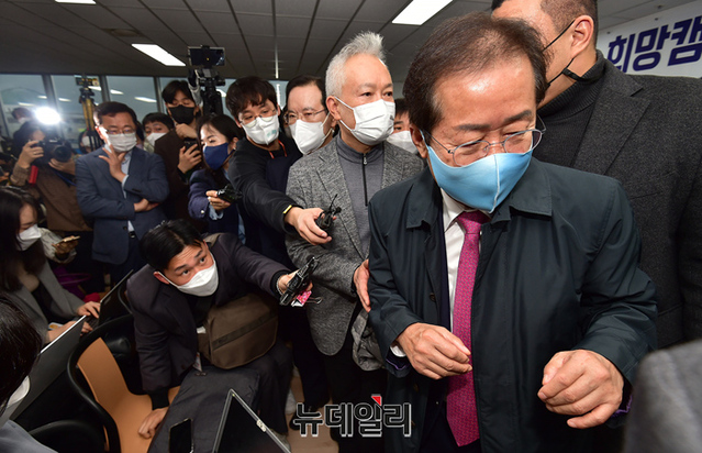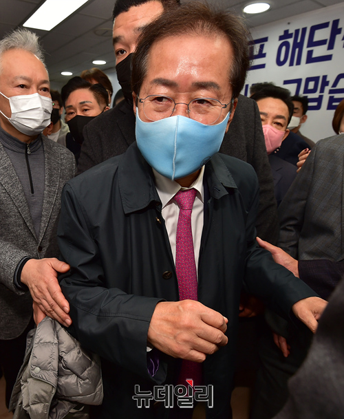 홍준표 전 국민의힘 대선 예비후보가 8일 오전 서울 여의도 jp희망캠프에서 해단식을 마치고 취재진의 질문에 답하고 있다. 이날 해단식에는 홍 전 후보를 응원하기 위해 청년 지지자들이 대거 몰렸다.