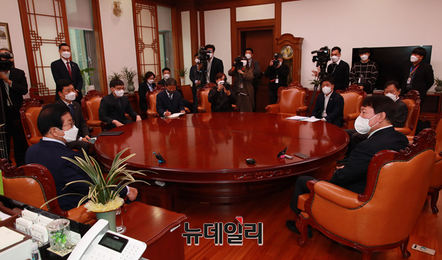 윤석열 국민의힘 대선후보가 8일 오전 국회에서 박병석 국회의장을 예방하고 대화를 나누고 있다. (사진=공동취재단)
