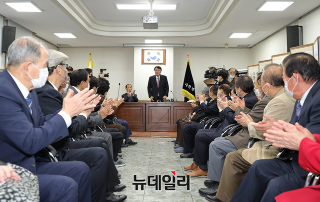 윤석열 국민의힘 대선후보가 8일 오전 국회 헌정회를 예방해 회원들과 대화를 나누고 있다. (사진=공동취재단)