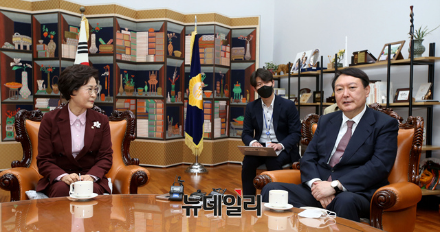 윤석열 국민의힘 대선 후보가 8일 오전 국회에서 김상희 국회부의장을 예방해 악수를 하고 있다. (사진=공동취재단)