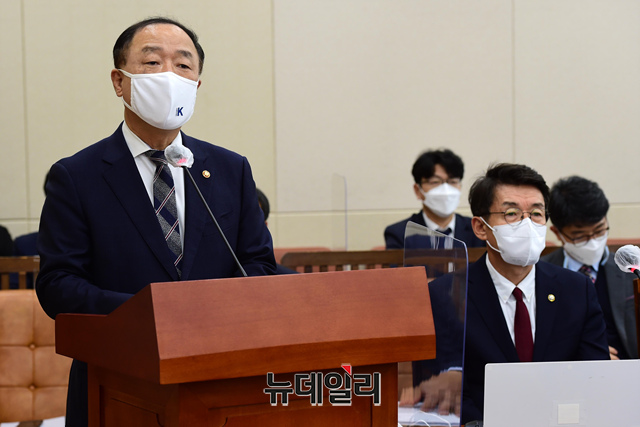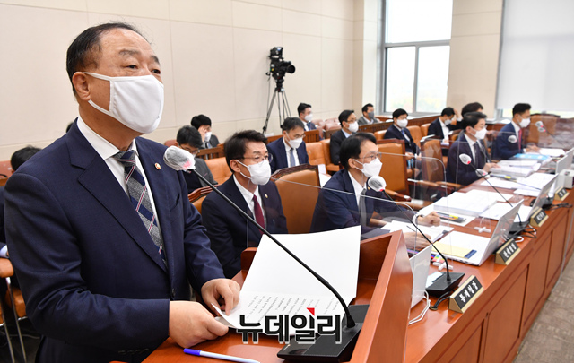홍남기 경제부총리 겸 기획재정부 장관이 8일 오후 국회 기획재정위원회에 참석해 2022년도 예산안 편성 등에 대한 업무보고를 하고 있다 (사진=공동취재단)