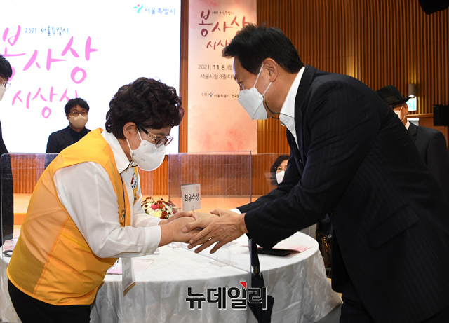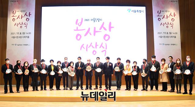 오세훈 서울시장이 8일 오후 서울시청 8층 다목적홀에서 열린 2021 서울특별시 봉사상 시상식에서 수상자들과 기념촬영을 하고 있다. (사진=서울시)