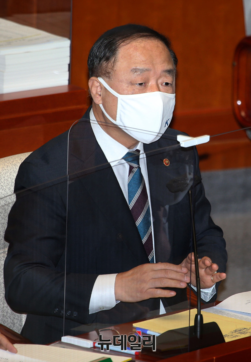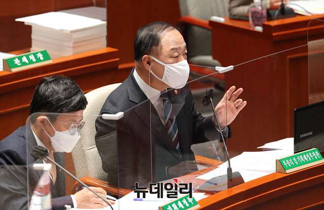 홍남기 경제부총리가 9일 오전 국회에서 열린 예산결산특별위원회에서 2022년도 예산안에 대한 의원들의 질문에 답변하고 있다. (사진=공동취재단)