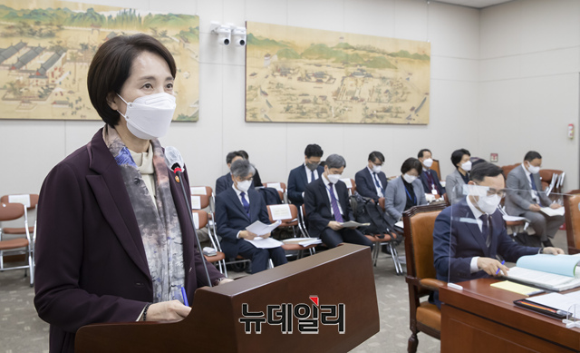 유은혜 사회부총리 겸 교육부 장관이 9일 국회 교육위원회 전체회의에서 의원들 질의에 답하고 있다. (사진=공동취재단)