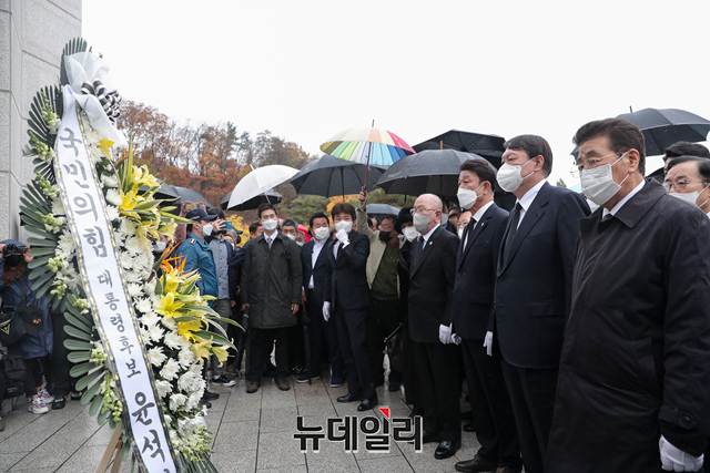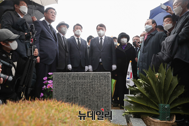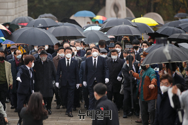 윤석열 국민의힘 대선후보가 9일 오후 서울 강북구 국립4.19민주묘지를 방문해 학생혁명 기념탑을 참배하고 있다.