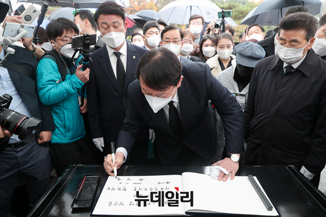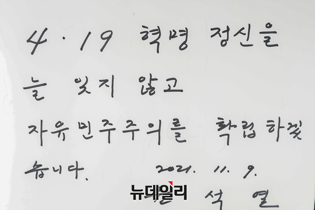 윤 후보는 방명록에 '4.19 혁명 정신을 늘 잊지 않고 자유민주주의를 확립하겠습니다'고 남겼다. (사진=윤석열 캠프)