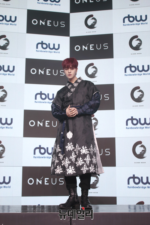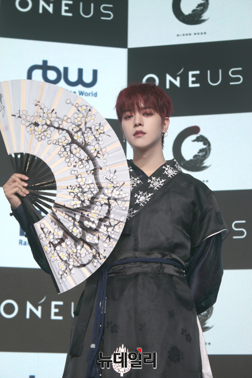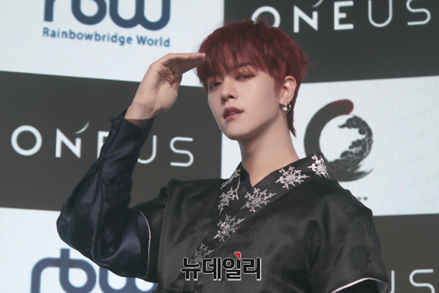 아이돌그룹 원어스(ONEUS) 멤버 레이븐이 9일 오후 온라인으로 진행된 여섯 번째 미니앨범 '블러드 문(BLOOD MOON)' 발매 기념 쇼케이스에서 포즈를 취하고 있다.
