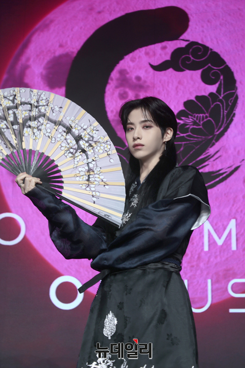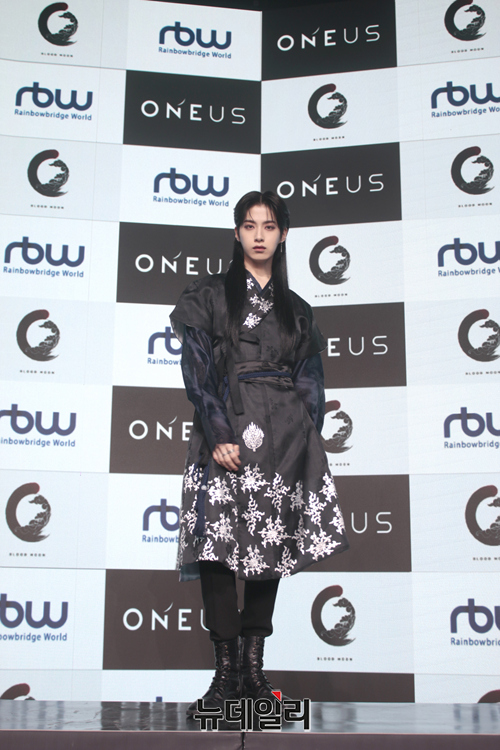 아이돌그룹 원어스(ONEUS) 멤버 시온이 9일 오후 온라인으로 진행된 여섯 번째 미니앨범 '블러드 문(BLOOD MOON)' 발매 기념 쇼케이스에서 포즈를 취하고 있다.