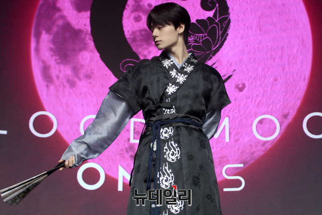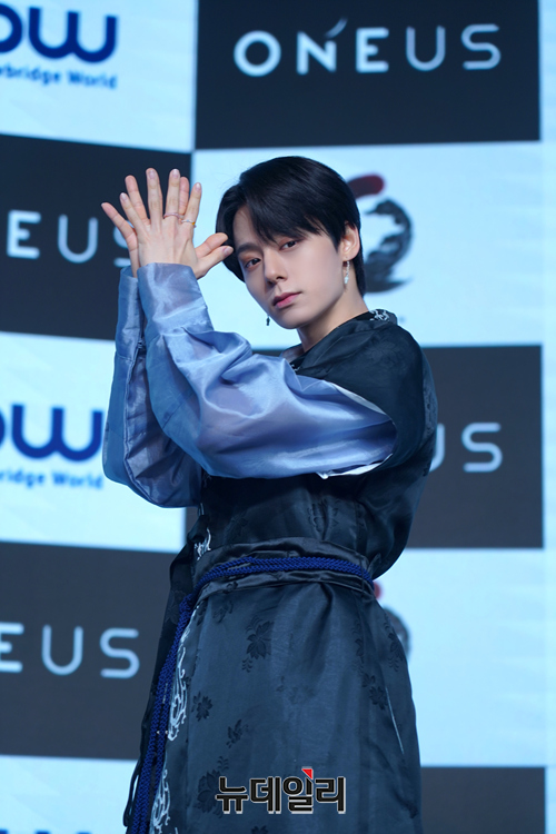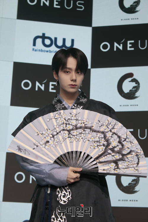 아이돌그룹 원어스(ONEUS) 멤버 환웅이 9일 오후 온라인으로 진행된 여섯 번째 미니앨범 '블러드 문(BLOOD MOON)' 발매 기념 쇼케이스에서 포즈를 취하고 있다.