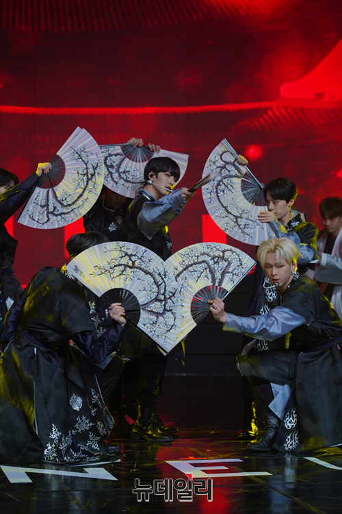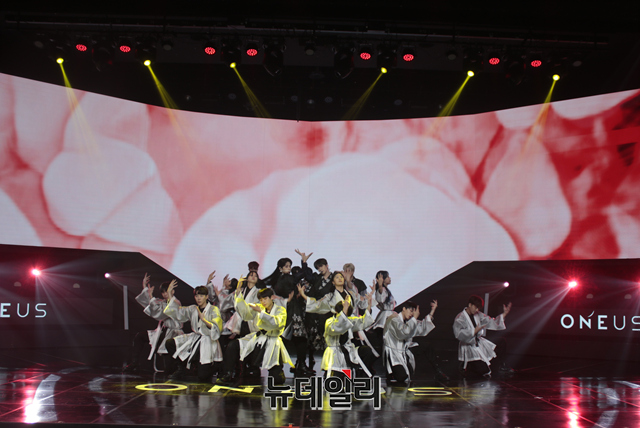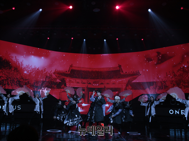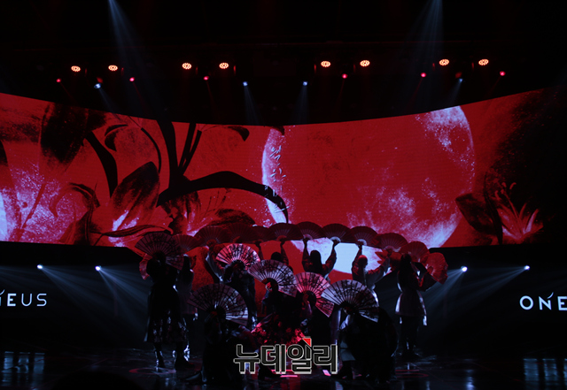 아이돌그룹 원어스(시온, 레이븐, 서호, 환웅, 건희, 이도)가 9일 오후 온라인으로 진행된 여섯 번째 미니앨범 '블러드 문(BLOOD MOON)' 발매 기념 쇼케이스에서 무대를 선보이고 있다.