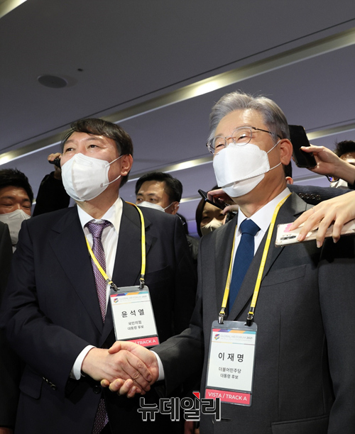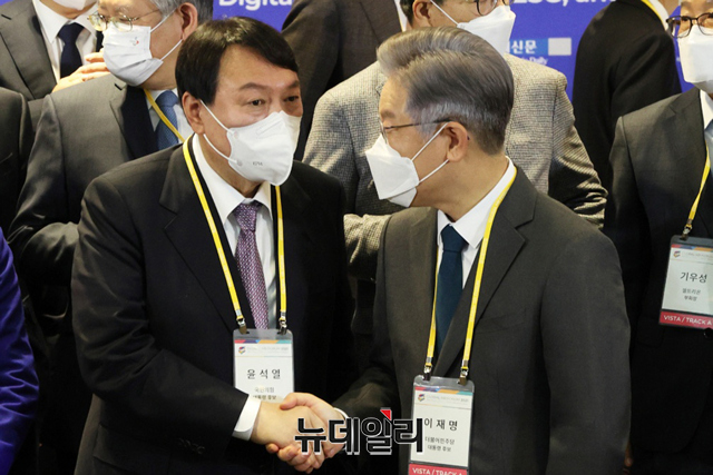 [포토] 대선 후보로 첫 대면한 이재명·윤석열