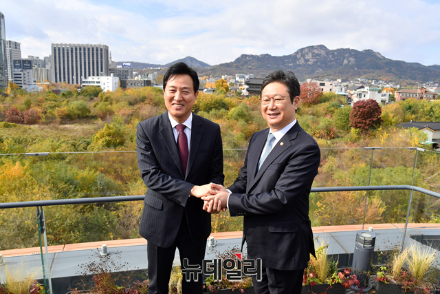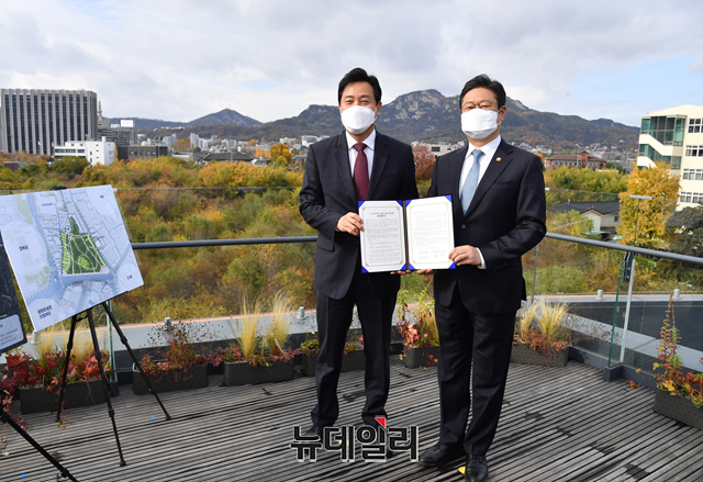 오세훈 서울시장(오른쪽)과 황희 문화체육관광부 장관이 10일 오전 서울 종로구 서울공예박물관에서 열린 가칭 이건희 기증관 건립을 위한 업무협약식에서 기념촬영을 하고 있다.