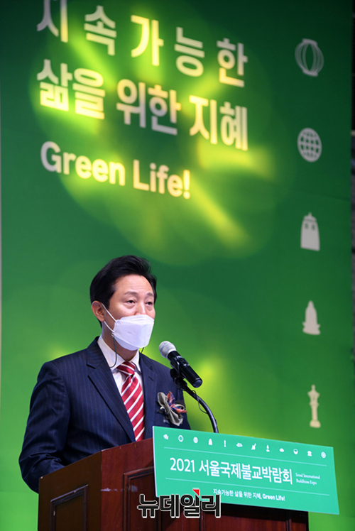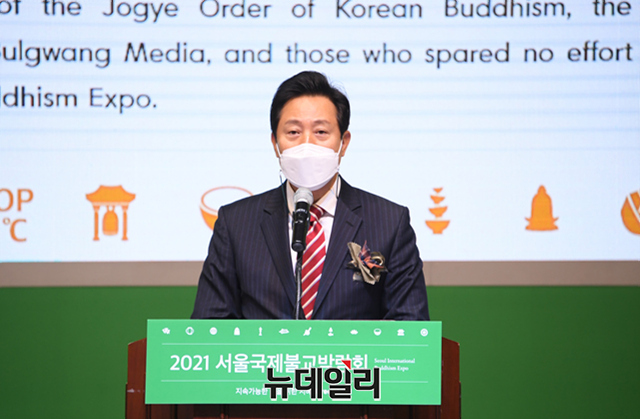 오세훈 서울시장이 11일 오전 서울 강남구 SETEC 서울무역전시컨벤션센터에서 진행된 2021 서울국제불교박람회 개막식에서 인사말을 하고 있다.