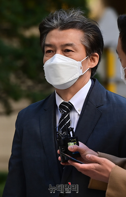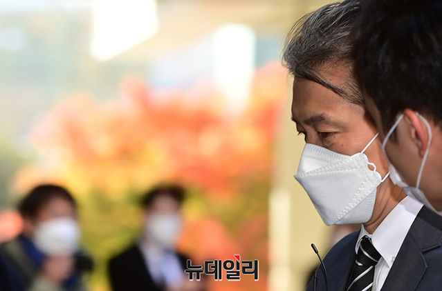 자녀 입시비리 등 혐의로 기소된 조국 전 법무부 장관이 12일 오전 서울 서초구 서울중앙지법에서 열린 1심 속행 공판에 출석하고 있다.