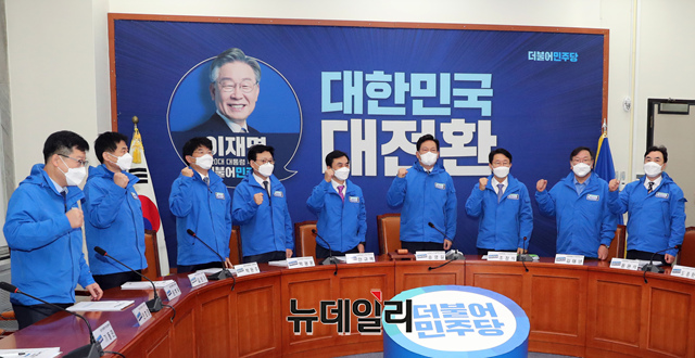 송영길 더불어민주당 상임선거대책위원장과 조정식 상임총괄선거대책본부장 등 참석자들이 12일 오전 국회에서 열린 총괄본부장단 회의에서 파이팅을 외치고 있다. (사진=공동취재단)
