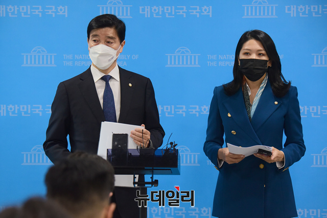 이해식 더불어민주당 의원과 신현영 의원이 12일 국회 소통관에서 이재명 후보 부인 김혜경 씨의 부상과 경위 관련 기자회견을 마치고 기자들의 질문에 답하고 있다.