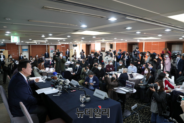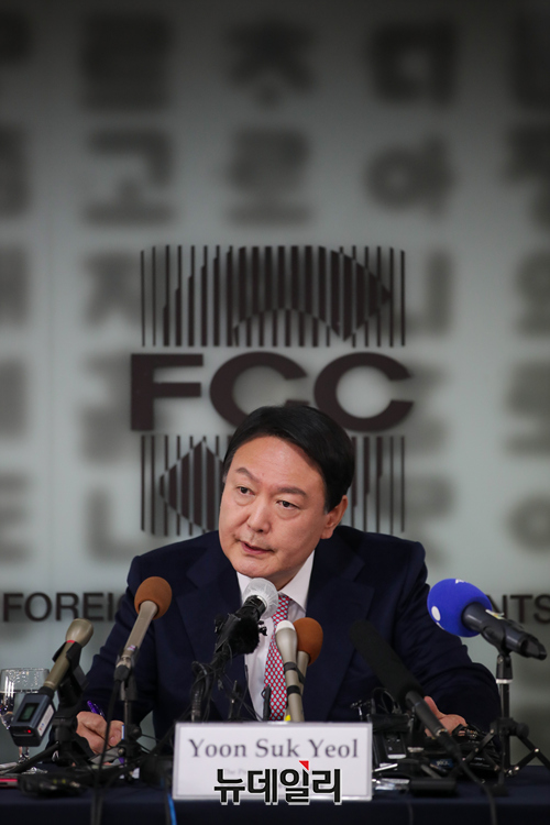 윤석열 국민의힘 대선 후보가 12일 오후 서울 중구 한국프레스센터에서 열린 서울외신기자클럽 초청 기자간담회에서 발언을 하고 있다. (사진=윤석열 캠프)