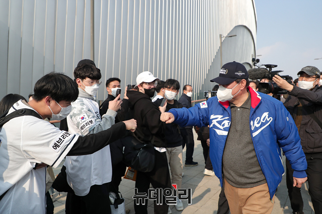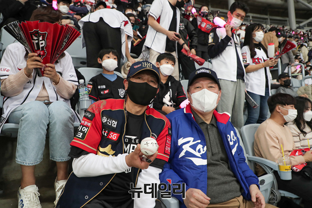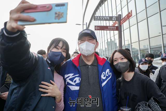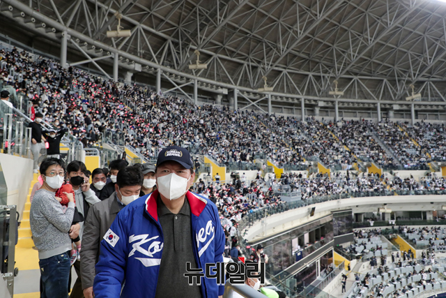 윤석열 국민의힘 대선 후보가 14일 오후 서울 구로구 고척스카이돔에서 진행된 2021 KBO 프로야구 한국시리즈 1차전 두산 베어스와 KT 위즈의 경기를 시민들과 함께 관람하고 있다. (사진=윤석열 캠프)