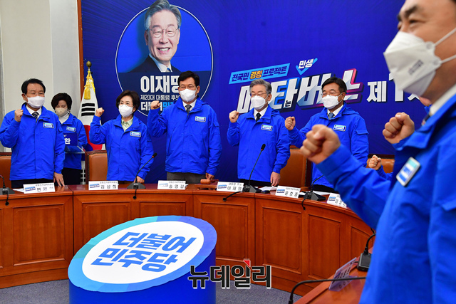 이재명 더불어민주당 대선후보와 송영길 상임선거대책위원장을 비롯한 공동선거대책위원장들이 15일 국회에서 열린 중앙선거대책위원회의에서 앞서 대선승리를 다짐하는 구호를 외치고 있다. (사진=공동취재단)