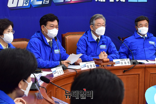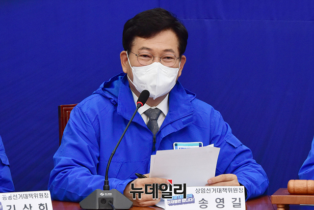 송영길 더불어민주당 상임선거대책위원장이 15일 국회에서 열린 중앙선거대책위원회의에서 발언을 하고 있다. (사진=공동취재단)